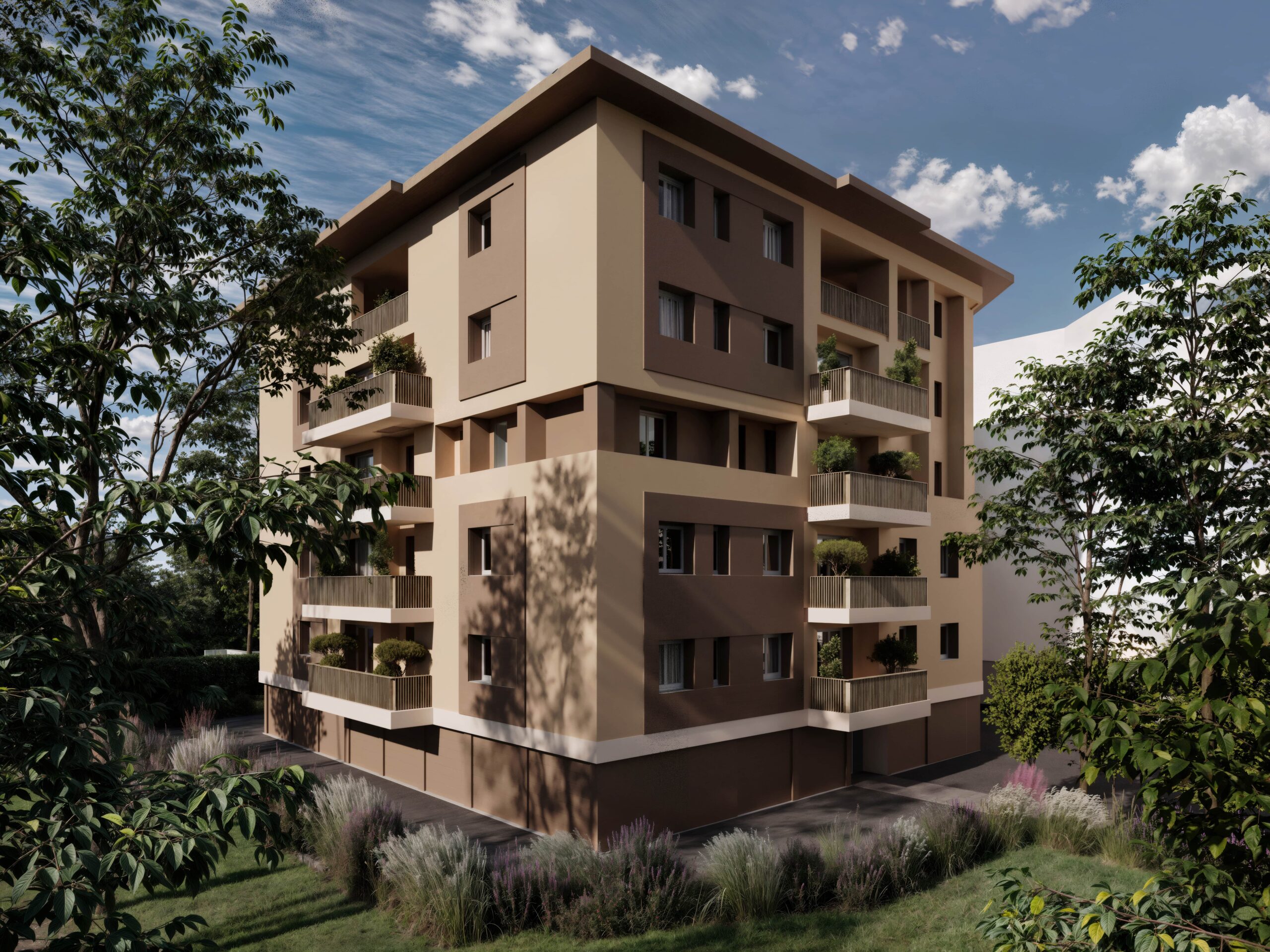 Realizzazione di una palazzina di 22 appartamenti di varie tipologie e metrature con cantine, autorimesse e giardini privati.